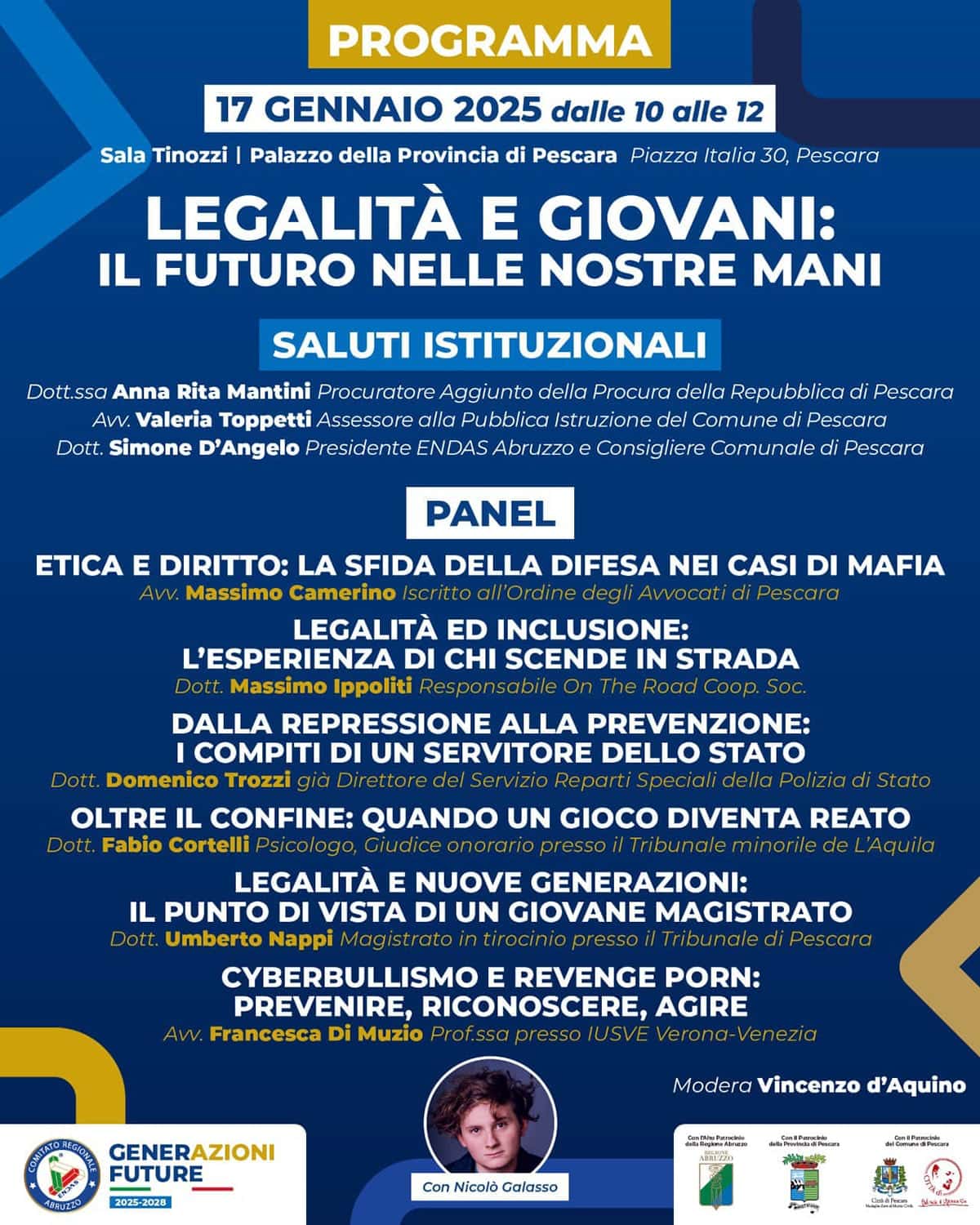 Le classi 4A, 4B e 4F/H hanno partecipato al convegno “Legalità e giovani: il futuro nelle nostre mani” presso la Sala Tinozzi del Palazzo della Provincia di Pescara. Un evento ricco di spunti di riflessione e testimonianze di grande impatto.